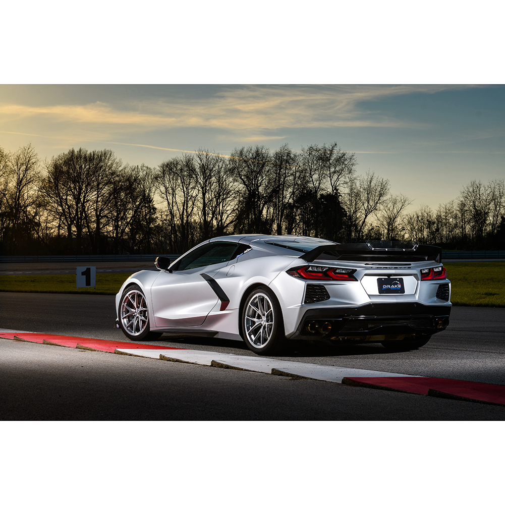 The Drake Muscle Cars C8 Corvette Rear Spoiler in Wicker Bill Style is a striking upgrade designed to enhance both the aesthetics and aerodynamics of your C8 Corvette. Featuring a sleek satin black finish, this spoiler is crafted to provide a bold, aggressive look that complements the car's modern design. Made from high-quality ABS material, it offers durability and resistance to the elements, ensuring long-lasting performance. The wicker bill design not only adds a distinctive visual appeal but also helps improve downforce, enhancing stability and handling at high speeds. Engineered to fit seamlessly, this rear spoiler is an excellent choice for enthusiasts looking to elevate the style and functionality of their Corvette. Comes with mounting hardware.