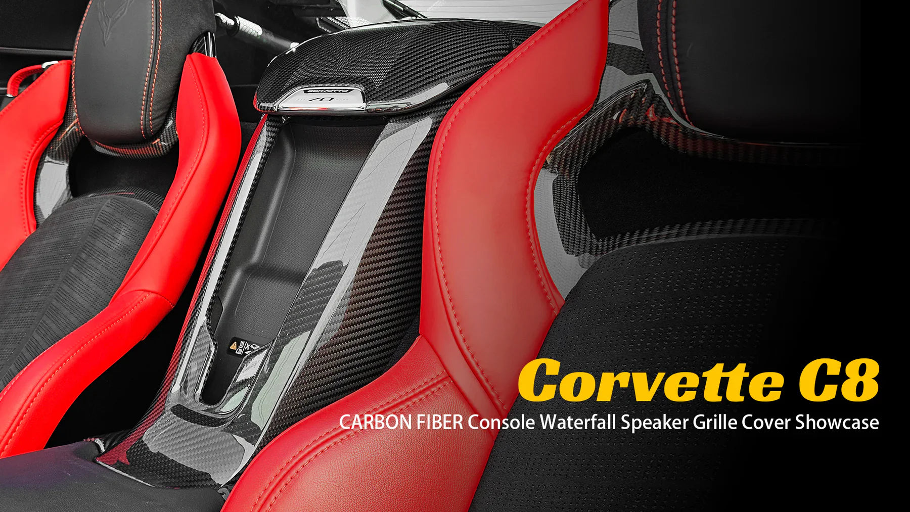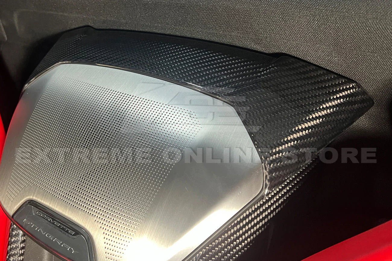 The Corvette C8 Convertible Carbon Fiber Console Waterfall & Speaker Overlay Grill Cover is an optional upgrade for the interior of the 2023 Chevrolet Corvette C8 Convertible. It is a decorative piece that covers the speaker grille located on the center console between the driver and passenger seats. The grille is made from carbon fiber, a lightweight and strong material commonly used in high-performance sports cars.